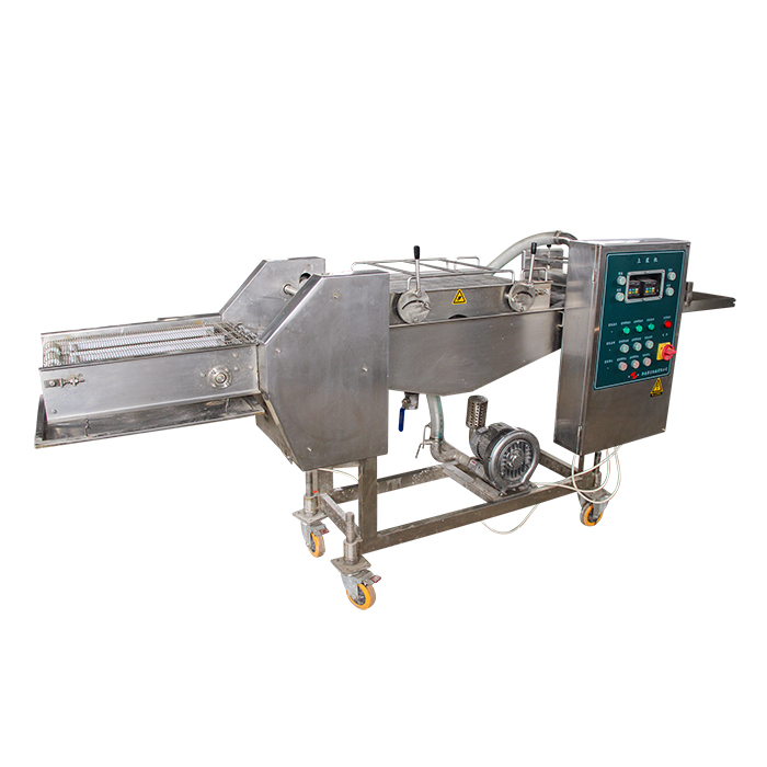 濃漿機(jī)是產(chǎn)品經(jīng)過上下輸送網(wǎng)帶夾持,在漿液中產(chǎn)品粘附面漿。通過風(fēng)刀時,多余的漿液被吹落。然后輸入到下一工序。產(chǎn)品適合于天婦羅產(chǎn)品。