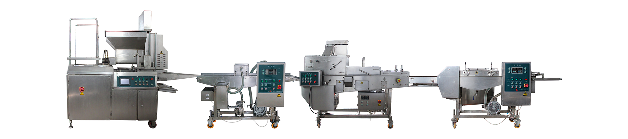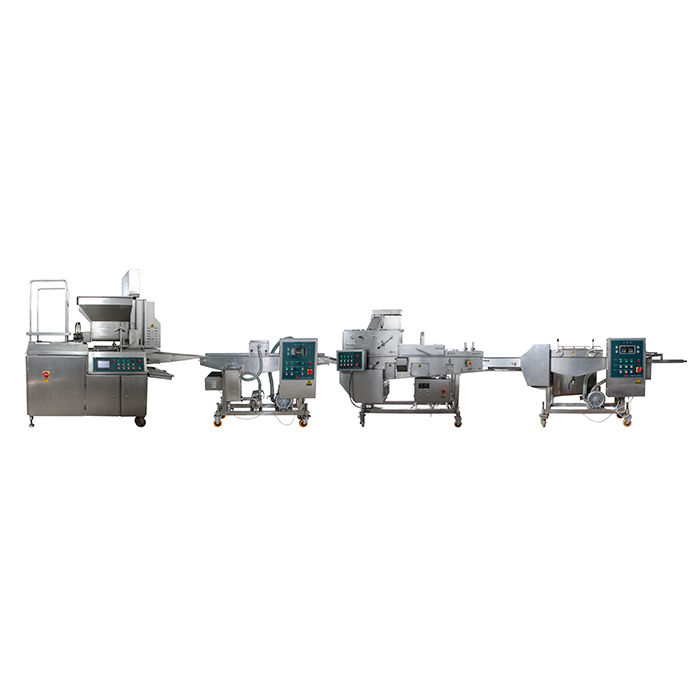 雞塊生產(chǎn)線把混合好的原料經(jīng)過模板成型,上稀漿,上粉,上稠漿,油炸,速凍等工藝做出不同厚度不同形狀的雞塊。模板可以生產(chǎn)不同形狀的產(chǎn)品(如三角形,橢圓形,卡通雞塊形狀,不規(guī)則形狀)通過模板更換產(chǎn)品。全自動雞塊生產(chǎn)線適用于肉類、水產(chǎn)、蔬菜、奶酪以及它們混合料。上校雞塊生產(chǎn)線的需要配置前處理設(shè)備和后處理設(shè)備:絞肉,混合,油炸包裝等設(shè)備,麥樂雞塊生產(chǎn)線與這些配套設(shè)備組成一條完整的快餐調(diào)理生產(chǎn)線。