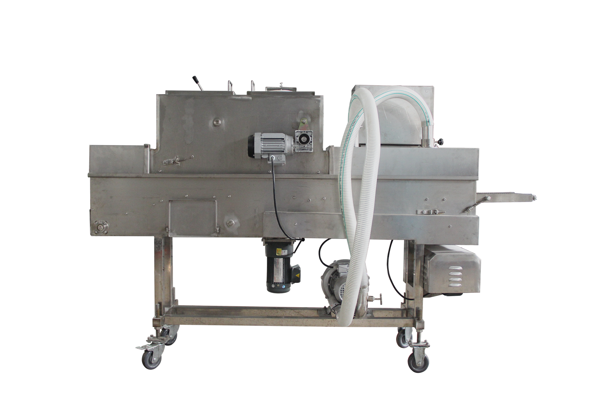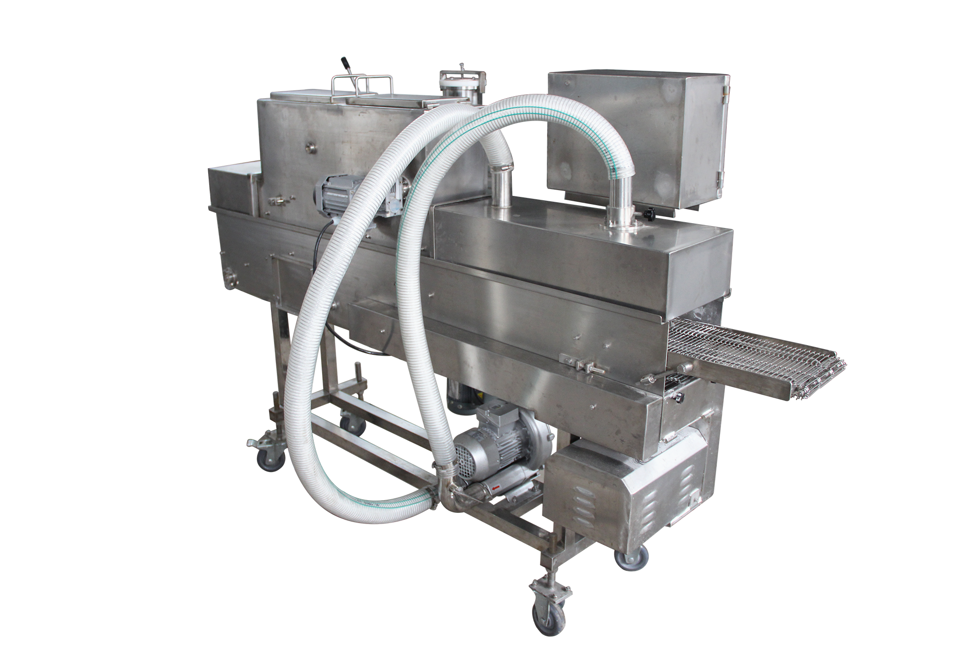 裹粉機能自動完成產品的上粉過程,適用于各種預上粉、混合粉等。產品進入下網(wǎng)帶,底部及側面沾滿粉,從上料斗流下的粉將產品上部覆蓋,經壓輥壓緊(上下網(wǎng)帶上的粉厚度可以方便調節(jié)),上粉后經過風管,將多余的粉吹落。進入下一道程序。