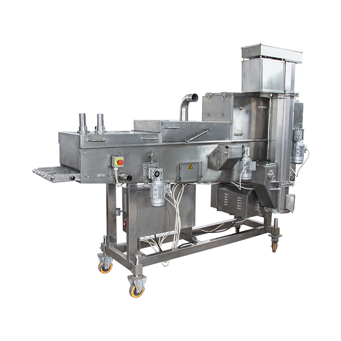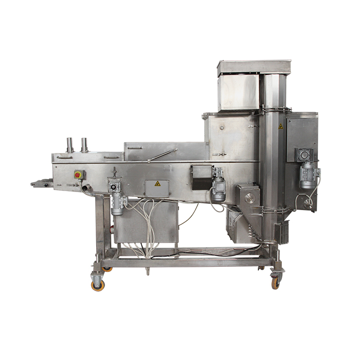 裹粉機能自動完成產(chǎn)品的預(yù)上粉過程,適用于各種預(yù)上粉、混合粉以及細面包糠到中等顆粒面包屑裹涂。產(chǎn)品進入下網(wǎng)帶,底部及側(cè)面沾滿粉,從上料斗流下的粉將產(chǎn)品上部覆蓋,經(jīng)壓輥壓緊(上下網(wǎng)帶上的粉厚度可以方便調(diào)節(jié)),上粉后經(jīng)過風管,將多余的粉吹落。進入下一道程序。