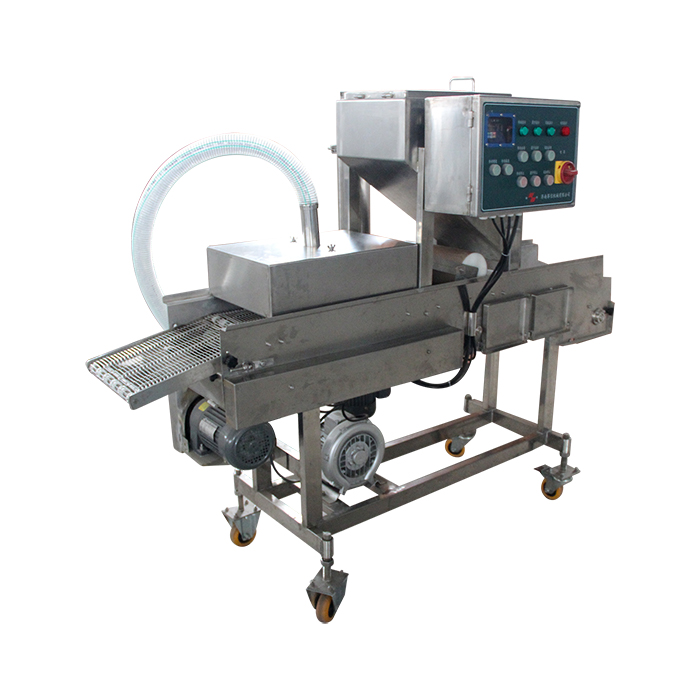 上面包康機(jī)是通過(guò)料斗里泄出的面包糠和下網(wǎng)帶上的面包糠將產(chǎn)品均勻涂裹在產(chǎn)品上,經(jīng)壓輥壓緊(上下網(wǎng)帶上的面包屑厚度可以方便調(diào)節(jié)),上康后經(jīng)風(fēng)機(jī),將多余的面包屑吹落。進(jìn)入下一道程序。