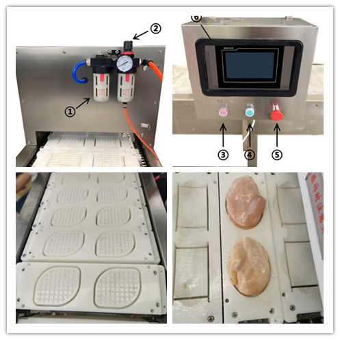 鮮肉整形機通過過更換不同的刀組把各種鮮肉切成成各種方形,圓形,橢圓形及其他異形等,更換刀組方便。